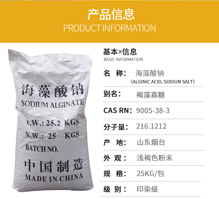 1.活性染料的助染劑海藻酸鈉在印染工業中用作活性染料色漿,優于糧食淀粉和其它漿料。印出的紡織品花紋鮮艷,線條清晰,給色量高,得色均勻,滲透性與可塑性均良好。海藻膠現已廣泛應用于棉、毛、絲、尼龍等各種織品的印花,特別適用于配制撥染印花漿。